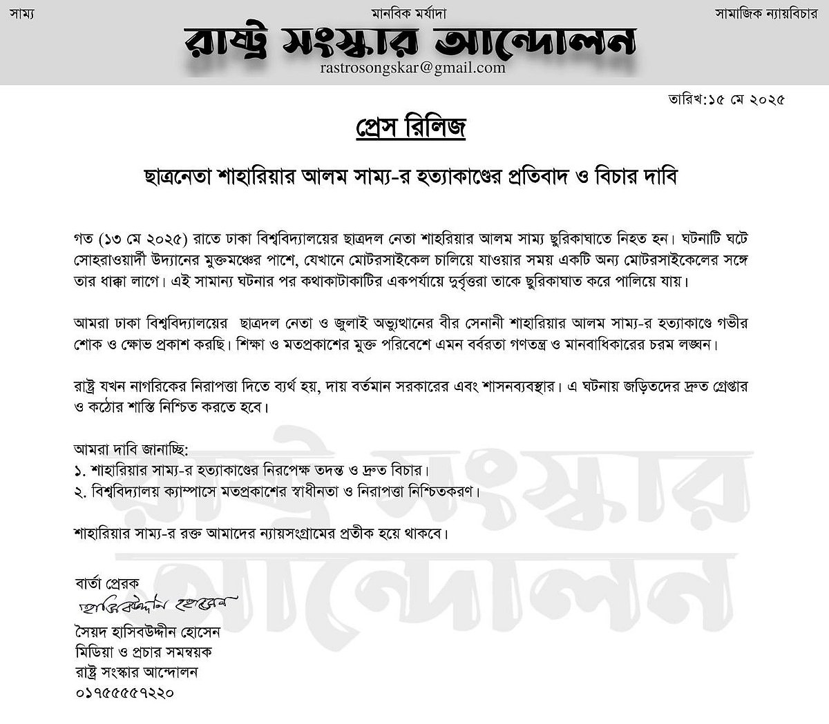 রাষ্ট্র সংস্কার আন্দোলন বিবৃতিতে আরও বলেছে, ‘শাহারিয়ারের রক্ত ন্যায়সংগ্রামের প্রতীক হয়ে থাকবে।’