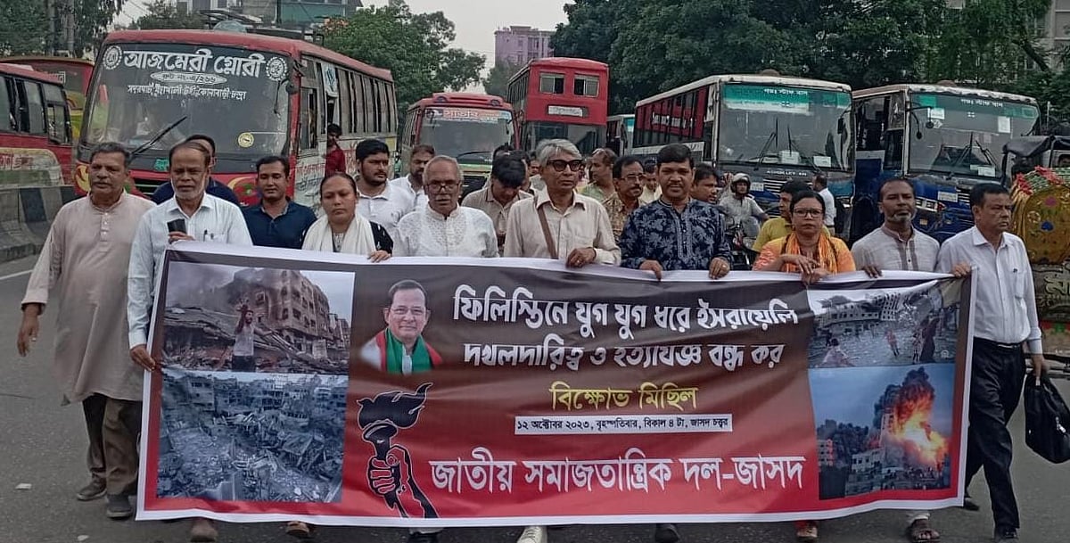 ফিলিস্তিনের গাজায় ইসরায়েলের নির্বিচার বোমা হামলা, বর্বর হত্যাযজ্ঞ ও অমানবিক অবরোধের প্রতিবাদে রাজধানীতে বিক্ষোভ মিছিল করেছে জাতীয় সমাজতান্ত্রিক দল (জাসদ)।
