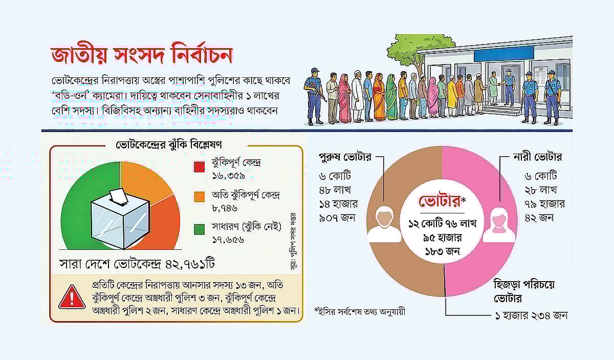 আগামী জাতীয় সংসদ নির্বাচনে সারা দেশে ৮ হাজার ৭৪৬টি ভোটকেন্দ্রকে অতি ঝুঁকিপূর্ণ হিসেবে চিহ্নিত করেছে পুলিশ। এর মধ্যে অতি ঝুঁকিপূর্ণ ভোটকেন্দ্র সবচেয়ে বেশি ঢাকা বিভাগে, ২ হাজার ৬৭৫টি। আর সিলেট বিভাগে অতি ঝুঁকিপূর্ণ ভোটকেন্দ্রের সংখ্যা সবচেয়ে কম। সেখানে এমন কেন্দ্র রয়েছে ৪৫৭টি।