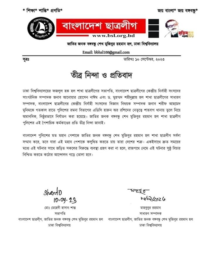 কেন্দ্রীয় দুই নেতাকে শাহবাগ থানায় নিয়ে বেদম পেটানোর ঘটনার নিন্দা ও প্রতিবাদ জানিয়েছে ঢাকা বিশ্ববিদ্যালয়ের জাতির জনক বঙ্গবন্ধু শেখ মুজিবুর রহমান হল শাখা ছাত্রলীগ। তারা বলেছে, ‘গতকাল শনিবার রাতে পুলিশের রমনা জোনের অতিরিক্ত উপকমিশনার (এডিসি) হারুন অর রশিদের নেতৃত্বে ছাত্রলীগের কেন্দ্রীয় নেতা আনোয়ার হোসেন ও শরিফ আহমেদকে শাহবাগ থানায় তুলে নিয়ে অমানবিক ও নিষ্ঠুরভাবে নির্যাতন করা হয়েছে। আমরা পুলিশের এই পৈশাচিক কর্মকাণ্ডের তীব্র নিন্দা জানাই।’