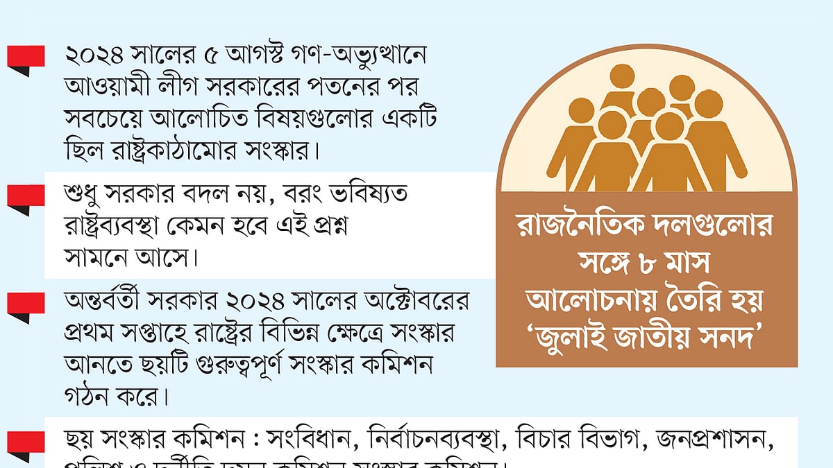 ২০২৪ সালের ৫ আগস্ট গণ-অভ্যুত্থানে আওয়ামী লীগ সরকারের পতনের পর সবচেয়ে আলোচিত বিষয়গুলোর একটি ছিল রাষ্ট্রকাঠামোর সংস্কার। শুধু সরকার বদল নয়, বরং কেমন রাষ্ট্রব্যবস্থা এই পরিবর্তনের ভেতর থেকে বেরিয়ে আসবে—এই প্রশ্নও তখন সামনে আসে।