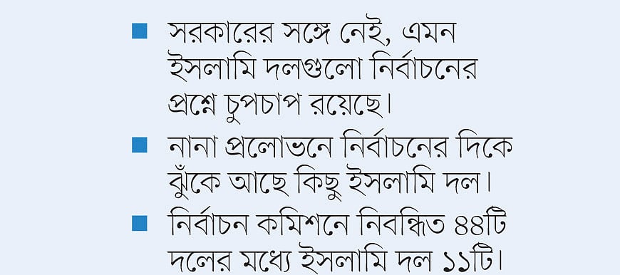 সরাসরি সরকারের সঙ্গে নেই—এমন ধর্মভিত্তিক ইসলামি দলগুলো আগামী জাতীয় নির্বাচনে অংশগ্রহণের প্রশ্নে দ্বিধায় আছে। একটি অংশ নানা প্রলোভনে নির্বাচনের দিকে ঝুঁকে আছে। তবে দলগুলোর বড় অংশটির দ্বিধা নৈতিকতার প্রশ্নে। কারণ, তারা চিন্তা করছে, দেশ ভালো চলছে না। এ অবস্থায় সরকারের সহযোগী হয়ে আরেকটি ‘পাতানো’ নির্বাচনে অংশ নিলে ধর্মভিত্তিক দল হিসেবে এর পরিণতি কী হতে পারে? তা ছাড়া মাঠপর্যায়ের নেতা-কর্মীরাও তা মেনে নেবেন কি না, সে দুশ্চিন্তাও আছে দলগুলোর ভেতরে।