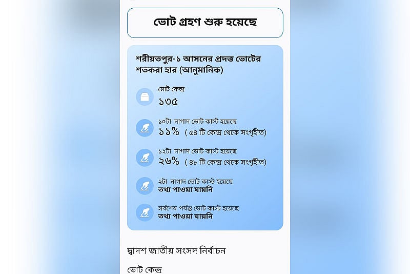 ফলাফলে গিয়ে দেখা যায়, সকাল ১০টা ও দুপুর ১২টা পর্যন্ত ভোটের ফলাফল হালনাগাদ করা হয়েছে। ফলাফল জানার জন্য দুপুর সাড়ে ১২টার ভোট পড়ার ফলাফল দেখতে অনেকক্ষণ অপেক্ষা করতে হয়। বেলা একটার দিকে অ্যাপে প্রবেশ করতে গেলে ৫ মিনিট পর্যন্ত ঘুরলেও কোনো কিছু আসছিল না।
