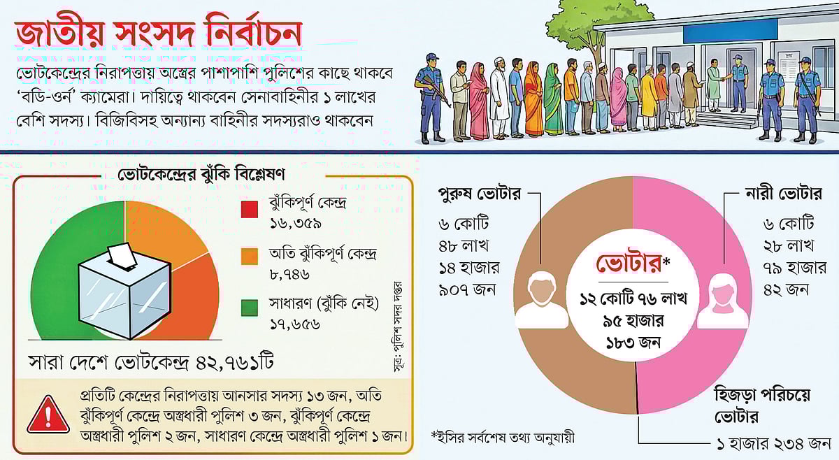 পুলিশের একটি সূত্র বলছে, অতি ঝুঁকিপূর্ণ কেন্দ্রে তিনজন পুলিশ সদস্য, ঝুঁকিপূর্ণ কেন্দ্রে দুজন সদস্য ও সাধারণ কেন্দ্রে একজন পুলিশ সদস্য মোতায়েন করার প্রাথমিক পরিকল্পনা হয়েছে। এর পাশাপাশি ভোটকেন্দ্রের নিরাপত্তার দায়িত্বে থাকা প্রত্যেক পুলিশ সদস্যের কাছে অস্ত্র এবং ‘বডি ওর্ন ক্যামেরা’ (ভিডিও ক্যামেরা, যা পোশাক বা ইউনিফর্মে যুক্ত করে রাখা যায়) থাকবে। এ ছাড়া প্রতিটি কেন্দ্রে ১৩ জন করে আনসার সদস্য মোতায়েন থাকবেন। এর বাইরে বাংলাদেশ সেনাবাহিনী, বর্ডার গার্ড বাংলাদেশ (বিজিবি) সদস্যরাসহ বিভিন্ন বাহিনী নিরাপত্তায় নিয়োজিত থাকবে।