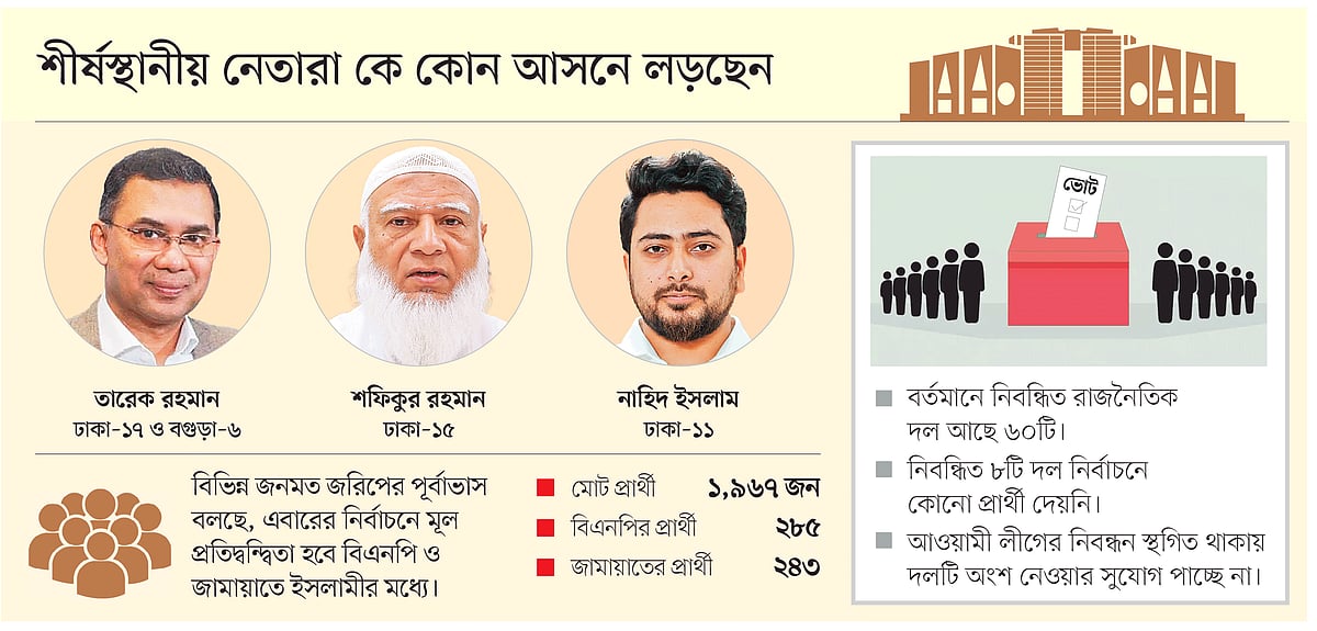 বিভিন্ন জনমত জরিপের পূর্বাভাস বলছে, এবারের নির্বাচনে মূল প্রতিদ্বন্দ্বিতা হবে বিএনপি ও জামায়াতে ইসলামীর মধ্যে। যুগপৎ আন্দোলনের শরিকদের সঙ্গে নির্বাচনে আসন সমঝোতা করেছে বিএনপি। যে আসনগুলোতে ধানের শীষের প্রার্থী নেই সেগুলোতে সমঝোতার ভিত্তিতে শরিকদের প্রার্থী রাখা হয়েছে। আবার অনেক আসনে দলীয় মনোনয়ন না পেয়ে বিএনপির নেতারা স্বতন্ত্র প্রার্থী হয়েছেন।