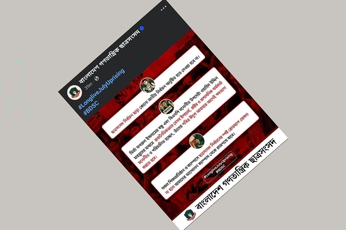 আজ বুধবার সন্ধ্যা ছয়টার দিকে গণতান্ত্রিক ছাত্র সংসদের ভেরিফায়েড ফেসবুক পেজে এক পোস্টে এ কথা বলা হয়েছে। গণতান্ত্রিক ছাত্র সংসদ জুলাই গণ-অভ্যুত্থানের সমন্বয়কদের একটি অংশের উদ্যোগে গঠিত ছাত্রসংগঠন।