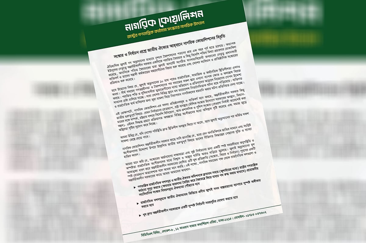 বিবৃতিতে নাগরিক কোয়ালিশন আরও বলছে, রাজনৈতিক দলগুলোকে জাতীয় ঐকমত্যের ভিত্তিতে প্রণীত জুলাই সনদ বাস্তবায়নের ব্যাপারে সুস্পষ্ট অঙ্গীকার করতে হবে। অন্তর্বর্তী সরকারকে দ্রুত সময়ের মধ্যে একটি সুস্পষ্ট নির্বাচনী সময়সূচির ঘোষণা করতে হবে।