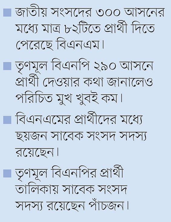 তৃণমূল বিএনপি ঘোষিত প্রার্থী তালিকাতেও চমক নেই। দলটি জানিয়েছে, ৩০০ আসনের মধ্যে ২৯০টিতে প্রার্থী দিয়েছে তারা। এদের মধ্যে কতজন রিটার্নিং কর্মকর্তার কাছে মনোনয়নপত্র জমা দিয়েছেন, সেটি গতকাল রাত সাড়ে ১০টা পর্যন্ত জানাতে পারেনি তারা। তবে দল ঘোষিত প্রার্থীদের মধ্যে পাঁচজন সাবেক সংসদ সদস্য রয়েছেন।