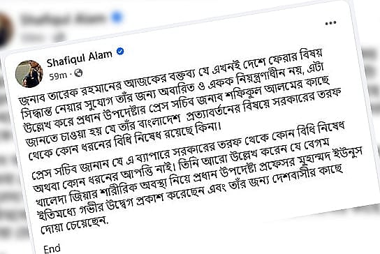 বিএনপির ভারপ্রাপ্ত চেয়ারম্যান তারেক রহমান দেশে ফেরা নিয়ে 'বাধা'র ইঙ্গিত দিলেও, প্রধান উপদেষ্টার প্রেস সচিব শফিকুল আলম জানিয়েছেন অন্তর্বর্তী সরকারের পক্ষ থেকে কোনো বাধা নেই। তারেক রহমানের দেশে ফেরার সিদ্ধান্ত এককভাবে নেওয়ার সুযোগ নেই বলায় এই আলোচনা শুরু হয়েছে। তবে সরকার কোনো আপত্তি করছে না। খালেদা জিয়ার অসুস্থতার মধ্যে তারেকের দেশে ফেরা নিয়ে আলোচনা শুরু হয়।
