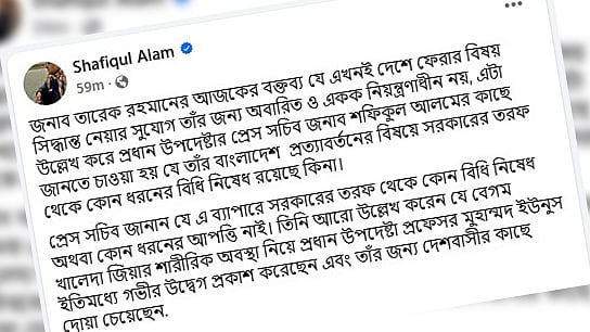 দেশে ফেরার সিদ্ধান্ত বাস্তবায়নের ক্ষেত্রে একক সিদ্ধান্ত গ্রহণের সুযোগ অবারিত ও একক নিয়ন্ত্রণাধীন নয়—তারেক রহমানের এই পোস্টের পর আজ শনিবার বিকেলে এক ফেসবুক পোস্টে প্রেস সচিব লিখেছেন, ‘এ ব্যাপারে সরকারের তরফ থেকে কোন বিধিনিষেধ অথবা কোনো ধরনের আপত্তি নেই।’