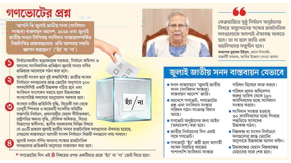 আগামী জাতীয় সংসদ নির্বাচন এবং জুলাই জাতীয় সনদ বাস্তবায়নে গণভোট হবে একই দিনে। চারটি বিষয়ের ওপর একটি প্রশ্নে হবে গণভোট। গণভোটে ‘হ্যাঁ’ জয়ী হলে আগামী সংসদ হবে দ্বিকক্ষবিশিষ্ট। সংসদ নির্বাচনে দলগুলোর প্রাপ্ত ভোটের অনুপাতে (পিআর পদ্ধতি) ১০০ সদস্য নিয়ে উচ্চকক্ষ গঠিত হবে।