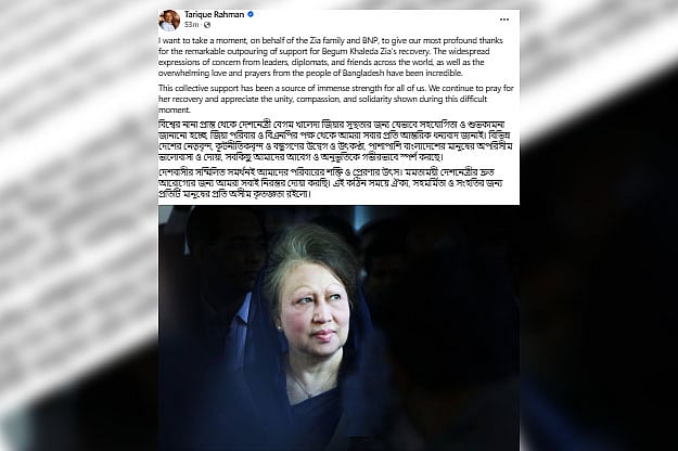 ওই স্ট্যাটাসে তারেক রহমান লিখেছেন, ‘বিশ্বের নানা প্রান্ত থেকে দেশনেত্রী বেগম খালেদা জিয়ার সুস্থতার জন্য যেভাবে সহযোগিতা ও শুভকামনা জানানো হচ্ছে, জিয়া পরিবার ও বিএনপির পক্ষ থেকে আমরা সবার প্রতি আন্তরিক ধন্যবাদ জানাই। বিভিন্ন দেশের নেতৃবৃন্দ, কূটনীতিকবৃন্দ ও বন্ধুগণের উদ্বেগ ও উৎকণ্ঠা, পাশাপাশি বাংলাদেশের মানুষের অপরিসীম ভালোবাসা ও দোয়া, সবকিছু আমাদের আবেগ ও অনুভূতিকে গভীরভাবে স্পর্শ করছে।