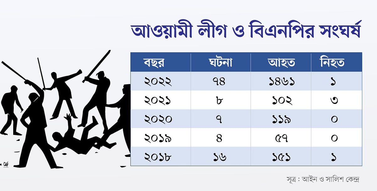 সরকারের এ মেয়াদে মাঠে প্রায় নিষ্ক্রিয় বিএনপির এ বছরের শেষ দিকে সক্রিয় হয়ে ওঠা এবং তাতে বাধা দেওয়ার কারণেই দুই দলের মধ্যে সংঘাত বেড়েছে বলে মনে করেন আইন ও সালিশ কেন্দ্রের নির্বাহী পরিচালক নূর খান। তিনি প্রথম আলোকে বলেন, বিরোধী দলের ওপর বল প্রয়োগের সংস্কৃতি এখনো বন্ধ হয়নি, বরং বেড়েছে। সরকার আক্রমণাত্মক ভূমিকা নিয়েছে। সমঝোতার রাজনীতি প্রতিষ্ঠা না হওয়া পর্যন্ত এটা বেড়েই চলবে। ২০২৪ সালে নির্বাচন হবে বলে ঘোষণা এসেছে। যদি রাজনৈতিক সহিষ্ণুতা না তৈরি হয়, তবে আগামী বছরে এসব সংঘাত আরও বেড়ে যাবে।