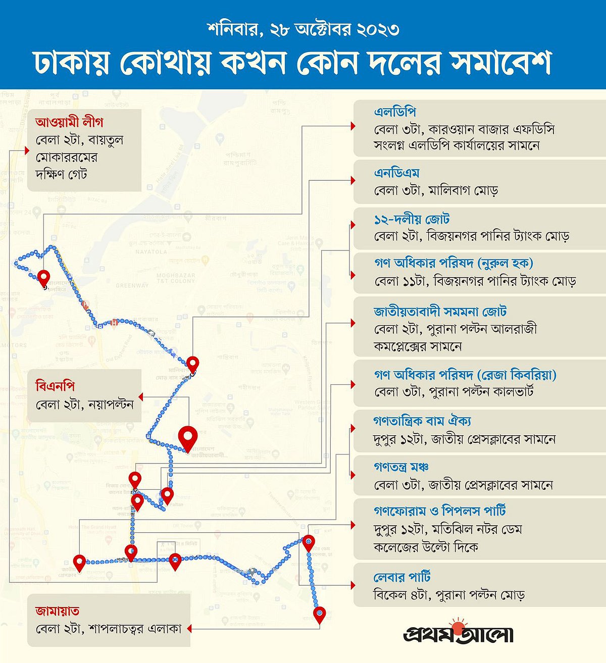 বেলা ১১টায় বিজয়নগরে বিজয়-৭১ চত্বরে এবি পার্টি, বেলা ১১টায় বিজয়নগর পানির ট্যাংকের মোড়ে গণ অধিকার পরিষদ (নুরুল হক), বেলা ৩টায় পুরানা পল্টন কালভার্ট রোডে গণ অধিকার পরিষদ (রেজা কিবরিয়া), দুপুর ১২টায় জাতীয় প্রেসক্লাব মোড়ে গণতান্ত্রিক বাম ঐক্য, বেলা ৩টায় মালিবাগ মোড়ে এনডিএম ও বিকেল ৪টায় পুরানা পল্টন মোড়ে লেবার পার্টি সমাবেশের ঘোষণা দিয়েছে।