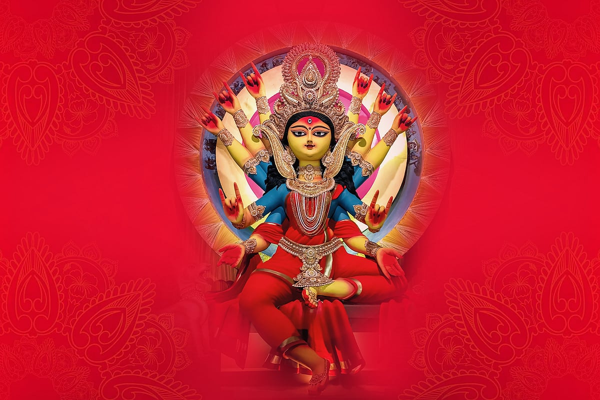 তবে দুর্গা নামটি শুনলেই আমাদের চোখের সামনে ভেসে ওঠে একটা দেবীপ্রতিমা। তাঁর দশ হাতে দশ রকম অস্ত্র, এক পা সিংহের পিঠে, এক পা অসুরের কাঁধে। তাঁকে ঘিরে থাকেন গণেশ, লক্ষ্মী, সরস্বতী আর কার্তিক ঠাকুর। যাঁরা সেকেলে কেতায় ঠাকুর বানান, তাঁদের ঠাকুরের পেছনে চালচিত্রে আরও নানা রকম ঠাকুর দেবতার ছবিও আঁকা থাকে। আর যাঁরা আধুনিক, তাঁরা প্রতিমার মাথার ওপর একটি ক্যালেন্ডারের শিবঠাকুর ঝুলিয়ে রাখেন। মোটামুটি এই প্রতিমা বছরের পর বছর ধরে দেখে আমরা অভ্যস্ত।