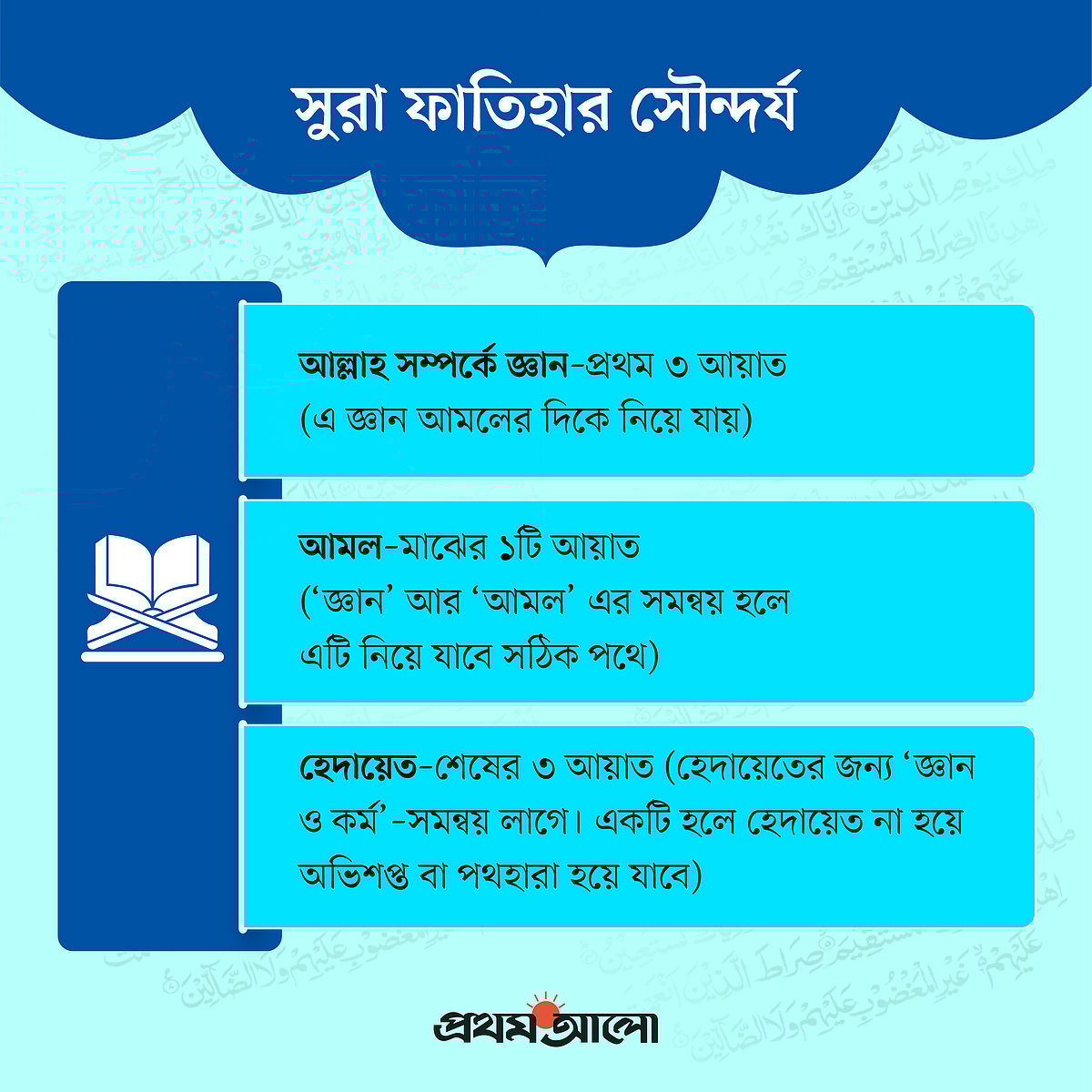 এই সাতটি আয়াতের মধ্যে প্রথম তিনটি আয়াতে আছে আল্লাহর পরিচয়। আর শেষ তিন আয়াতে আছে আল্লাহর কাছে আমাদের প্রার্থনা।