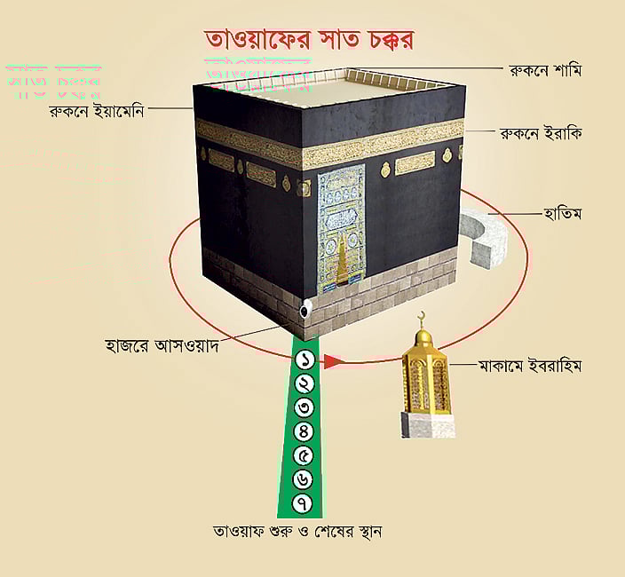 হাজরে আসওয়াদ থেকে মেঝেতে একটি দীর্ঘ দাগ কাটা রয়েছে, যা তাওয়াফের শুরু ও শেষের চিহ্ন। এই দাগ থেকে শুরু করে ঘড়ির কাঁটার বিপরীতে ঘুরে আবার একই স্থানে ফিরে এলে একটি তাওয়াফ সম্পন্ন হয়। এভাবে সাতবার তাওয়াফ করতে হয়। হাজরে আসওয়াদের পবিত্রতা ও তাৎপর্য মুসলিমদের হৃদয়ে গভীর শ্রদ্ধা ও ভক্তির প্রতীক হিসেবে বিদ্যমান।