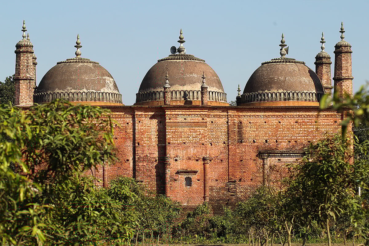 মসজিদের ছাঁদে একই সাইজের তিনটি গম্বুজ ও আটটি মিনার আছে। যার মধ্যে চার কোণের চারটি মিনার বড় এবং বাকি চারটি ছোট। ভিত্তিসহ পুরো মসজিদটিই চুন-সুরকির মর্টার এবং হাতে পোড়ানো ইট দিয়ে নির্মিত। ইটে কোনো কাজ না থাকলেও মসজিদের দেয়ালের বিভিন্ন স্থানে ইট কেটে বিভিন্ন নকশা তৈরি করা হয়েছে । ছবি তুলেছেন সৈয়দ জাকির হোসেন
