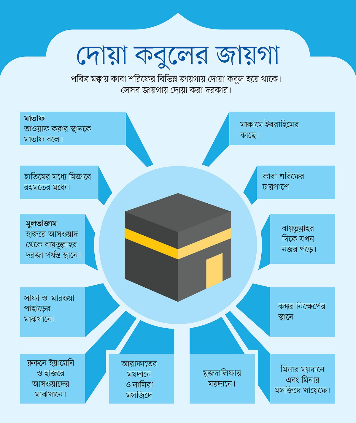 পবিত্র মক্কায় কাবা শরিফের বিভিন্ন জায়গায় দোয়া কবুল হয়ে থাকে। সেসব জায়গায় খুব আদব, ভক্তি ও বিনয়ের সঙ্গে খাস দিলে দোয়া করা দরকার। দুনিয়ার যাবতীয় জায়েজ নেক মাকসুদের জন্য দোয়া করা উচিত।