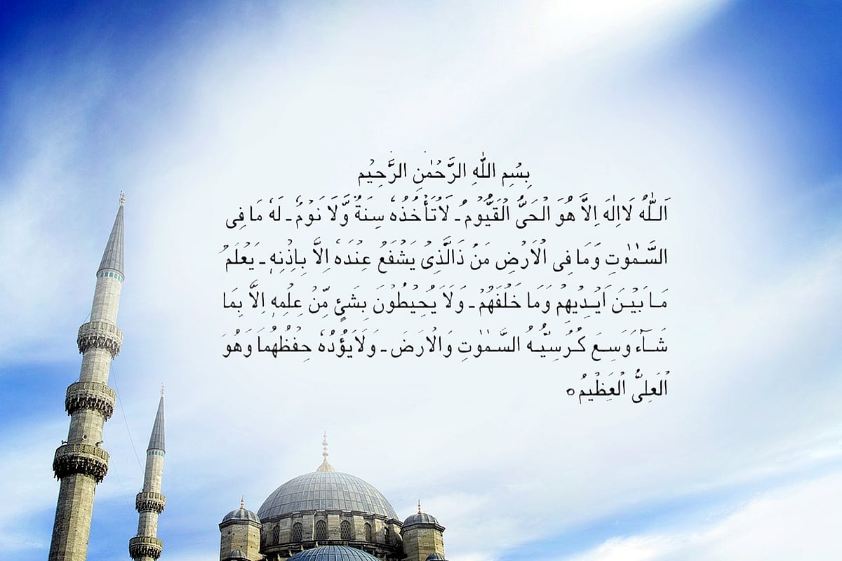 আল্লাহু লা ইলাহা ইল্লা হুওয়াল হাইয়্যুল কাইয়ুম। লা তা খুজুহু সিনাতু ওয়ালা নাউম। লাহু মা ফিস সামা ওয়াতি ওয়ামা ফিল আরদ। মান জাল্লাজি ইয়াশ ফাউ ইনদাহু ইল্লা বি ইজনিহি, ইয়া লামু মা বাইনা আইদিহিম ওয়ামা খালফাহুম, ওয়ালা ইউ হিতুনা বিশাই ইম মিন ইল মিহি ইল্লা বিমা শা আ, ওয়াসিয়া কুরসি ইউহুস সামা ওয়াতি ওয়াল আরদ, ওয়ালা ইয়া উদুহু হিফজুহুমা ওয়াহুয়াল আলি ইয়ুল আজিম।