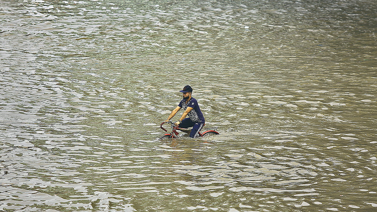 কারও মনে হতেই পারে–নদীতে সাইকেল চালিয়ে যাচ্ছেন এক তরুণ। অথচ ছবিটি রাজধানী ঢাকার প্রাণকেন্দ্র মতিঝিলের! প্রবল বৃষ্টিতে ঢাকা যেদিন পরিণত হয়েছিল বিশাল এক জলাশয়ে। রাস্তায় রাস্তায় পানি থইথই, আটকে পড়া গাড়িঘোড়া…। হাসান রাজার তোলা নটর ডেম কলেজের সামনের রাস্তার এই ছবি ছাপা হয়েছিল ২০১৭ সালের ২৭ জুলাই।