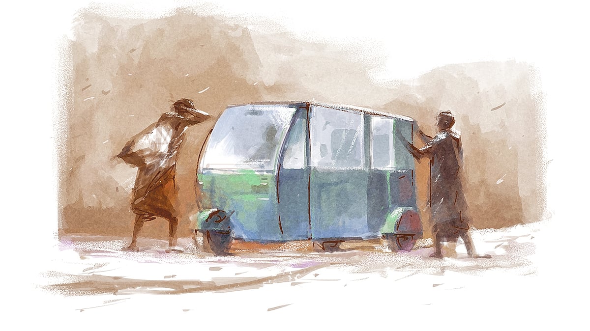বিপদে পড়া যাত্রীদের রিপন অগ্রাহ্য করতে পারে না। গুলশান মোড়ের দিকের রাস্তা ফাঁকা—একে লকডাউন তাতে ধুলার রাজ্য। সুযোগ বুঝে আকবর কনুই দিয়ে সহযাত্রীকে ধাক্কা দেয়। মোসলেম আবারও চমকায়—এখন তাকে গুঁজে রাখা দা বের করতে হবে। ঊরুকে ছুঁয়ে শাঁই করে দা বেরিয়ে এলে ভয় কেটে যায়। মাথার ওপরে তুলে বলে, ‘অটো দিয়া দে। দিয়া দে কইলাম।’