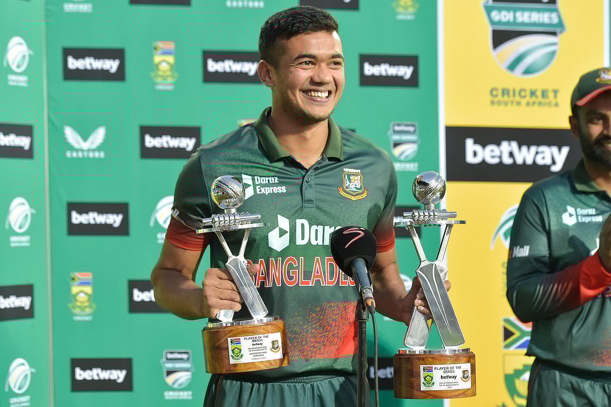 তাসকিন আহমেদের হাতে দুটি ট্রফি—একটি ম্যাচ সেরার, অন্যটি সিরিজ সেরার। পুরস্কার বিতরণী অনুষ্ঠানে ধারাভাষ্যকার পমি মবঙ্গয়ার সঙ্গে যখন কথা বলছিলেন, দুটি ট্রফি সামলাতে যেন মধুর কষ্টই হচ্ছিল তাসকিনের। ট্রফি দুটির ভার তেমন কিছু নয়, হয়তো অনভ্যস্ততাই একটু ভোগাচ্ছিল তাঁকে। বাংলাদেশের হয়ে ৯০টি আন্তর্জাতিক ম্যাচ খেলে ম্যান অব দ্য ম্যাচের পুরস্কারই যে এই প্রথম জিতলেন তিনি!