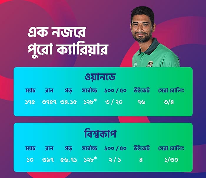 সময়ের প্রয়োজনে ক্লিন হিটার হয়ে উঠতেদ জানেন, বাংলাদেশের সবচেয়ে মোহনীয় ব্যাটসম্যানদের একজনও। ইচ্ছে করলেই খেলতে পারেন টপ অর্ডারে, আবার হয়ে উঠতে পারেন মিডল-লোয়ার মিডল অর্ডারের সবচেয়ে নির্ভরযোগ্য ব্যাটসম্যানও। ২০১৫ বিশ্বকাপের স্মৃতির আতশবাজিতে আবার কাঠি ঠুকে দিতে পারবেন তো এবার?