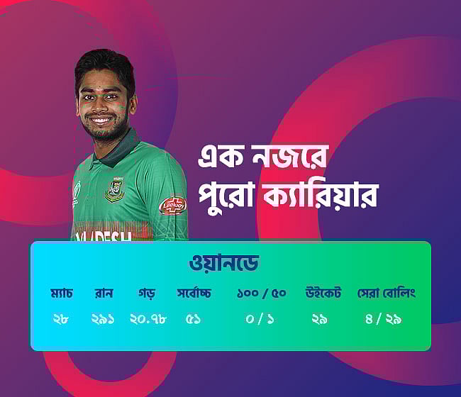 নির্ভুল লাইন লেংথই তাঁর বোলিংয়ের মূল অস্ত্র। বিশেষ করে পিচে স্পিনারদের জন্য বিন্দুমাত্র সাহায্য যদি থেকে থাকে, মিরাজ হয়ে ওঠেন অনবদ্য। বয়সটা নেহাতই কম, আন্তর্জাতিক অঙ্গনেও খুব বেশি দিনের বিচরণ নয় তাঁর। উন্নতির এখনো ঢের বাকি তাঁর, বিশেষ করে ব্যাটিংয়ে। তবে কঠোর পরিশ্রমই যার মূলমন্ত্র, যিনি ক্যারিয়ারের শুরুতেই ‘ফোকাস না হারানো’র মতো বড় প্রতিশ্রুতি উচ্চারণ করতে জানেন, দুর্দান্ত ক্রিকেট মস্তিষ্কের উদাহরণ দিয়ে যিনি শত প্রতিকূলতার মধ্যেও পারফর্ম করতে জানেন।