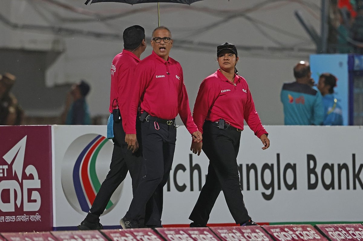 ফ্লাডলাইটের সমস্যায় প্রায় ৯ মিনিট খেলা বন্ধ থাকার পর তিন বল হতেই বৃষ্টি নামল। মাঠকর্মীরা তাড়াহুড়ো করে পিচ ও এর চারপাশ কাভারে ঢেকে ফেললেন। খেলোয়াড়েরাও ছুটলেন ড্রেসিংরুমের দিকে।