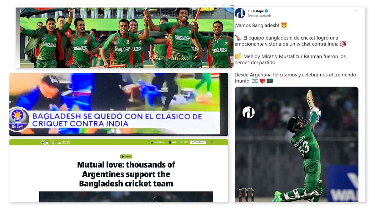 আর্জেন্টিনার সংবাদমাধ্যমেও স্থান পাচ্ছে বাংলাদেশের ক্রিকেটের খবর। মিরপুর শেরেবাংলা স্টেডিয়ামে পরশু ভারতের বিপক্ষে বাংলাদেশের অবিশ্বাস্য জয়ের খবর টুইট করেছে আর্জেন্টাইন রেডিও ‘এল ডেসট্যাপ’। জয়ের নায়ক মেহেদী হাসান মিরাজের জয় উদ্যাপনের উড়ন্ত ছবিও টুইট করেছেন অনেক আর্জেন্টাইন।
