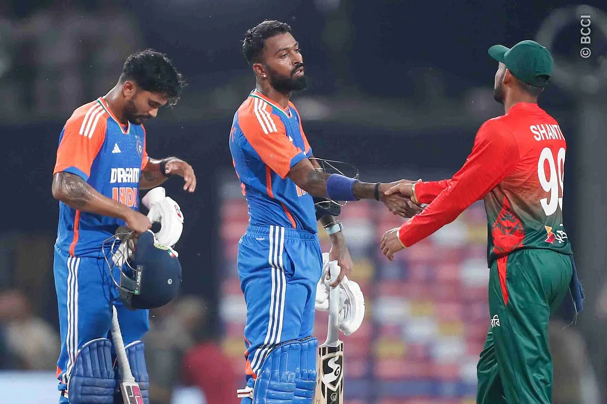 বাংলাদেশ ইনিংস: ১৯.৫ ওভারে ১২৭ (পারভেজ ৮, লিটন ৪, নাজমুল ২৭, হৃদয় ১২, মাহমুদউল্লাহ ১, জাকের ৮, মিরাজ ৩৫*, রিশাদ ১১, তাসকিন ১২, শরীফুল ০, মোস্তাফিজ ১; অর্শদীপ ৩/১৪, পান্ডিয়া ১/২৬, বরুণ ৩/৩১, মায়াঙ্ক ১/২১, নীতিশ ০/১৭, ওয়াশিংটন ১/১২)।