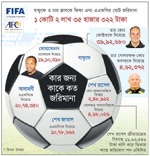 বিদেশি ফুটবল কোচ ও খেলোয়াড়দের ঠিকমতো বেতন না দেওয়া এবং ফিফা-এএফসির আইন ভঙ্গ করার দায়ে বাংলাদেশ ফুটবল ফেডারেশনসহ (বাফুফে) দেশের শীর্ষ চারটি ক্লাবকে গত দুই বছরের মধ্যে আর্থিক দণ্ড দিতে হয়েছে ১ কোটি টাকারও বেশি।