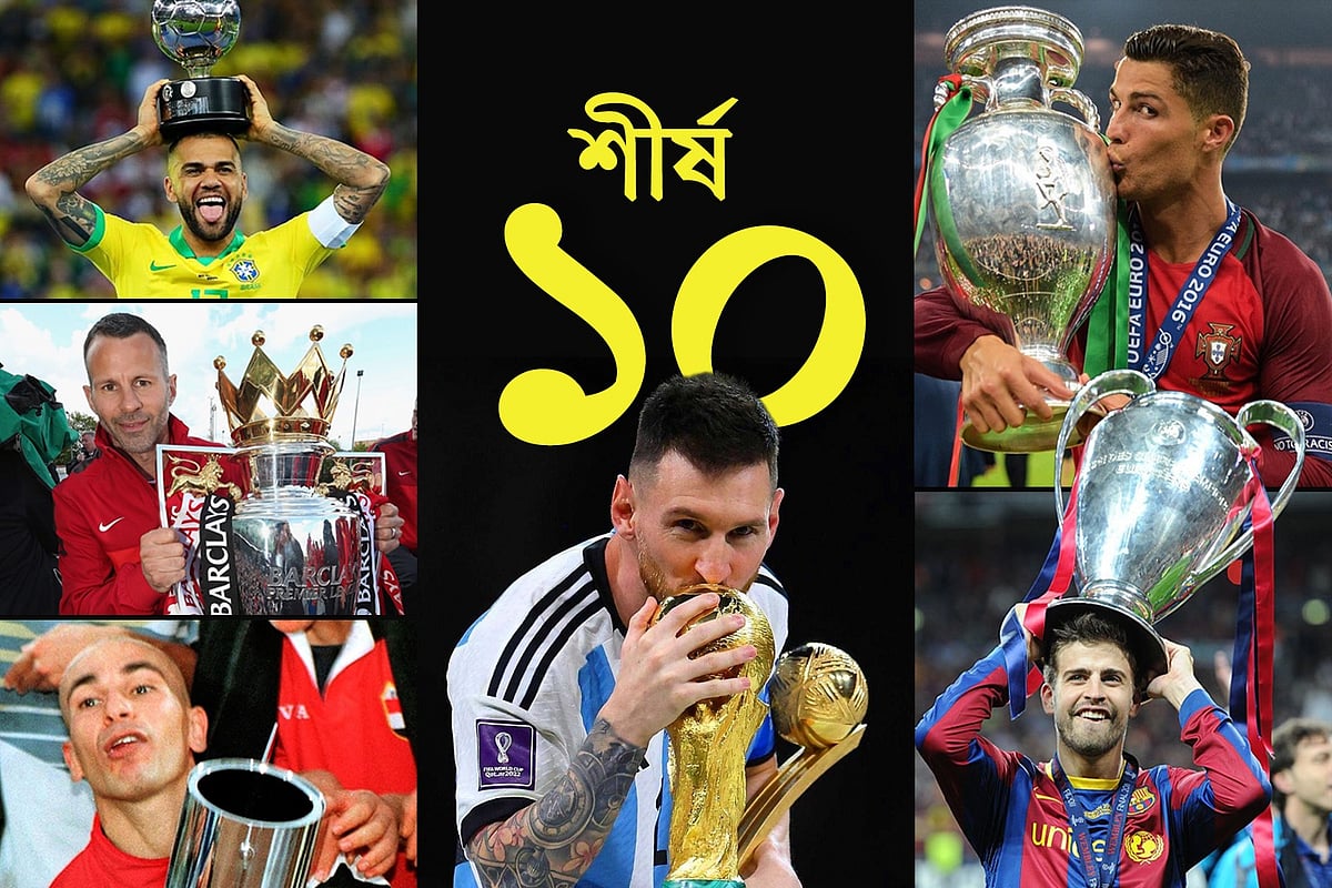 দলের হয়ে ট্রফি জেতাই একজন ফুটবলারের সর্বোচ্চ সাফল্য ও সবচেয়ে বড় তৃপ্তি। তবে কাজটা মোটেও সহজ নয়। ফুটবল ইতিহাসে এমন অনেক কিংবদন্তি আছেন, যাঁরা মাঠে দুর্দান্ত ছিলেন; কিন্তু খুব বেশি শিরোপা জিততে পারেননি। আবার এমন কজন ফুটবলার আছেন, যাঁরা বড় মঞ্চে বারবার সফল হয়েছেন। শিরোপার স্বাদ পাওয়া যেন অভ্যাস বানিয়ে ফেলেছিলেন তাঁরা। তাঁদের ট্রফির তালিকা যত লম্বা, বিশ্ব ফুটবলে প্রভাবও তত গভীর। কে কতবার শিরোপার মঞ্চে উঠেছেন, ট্রফি উঁচিয়ে উল্লাস করছেন, তা জানতে নজর দেওয়া যাক সংখ্যার দিকে। চলুন দেখে নেওয়া যাক ফুটবল ইতিহাসে সবচেয়ে বেশি ট্রফি জিতেছেন কোন ১০ ফুটবলার।