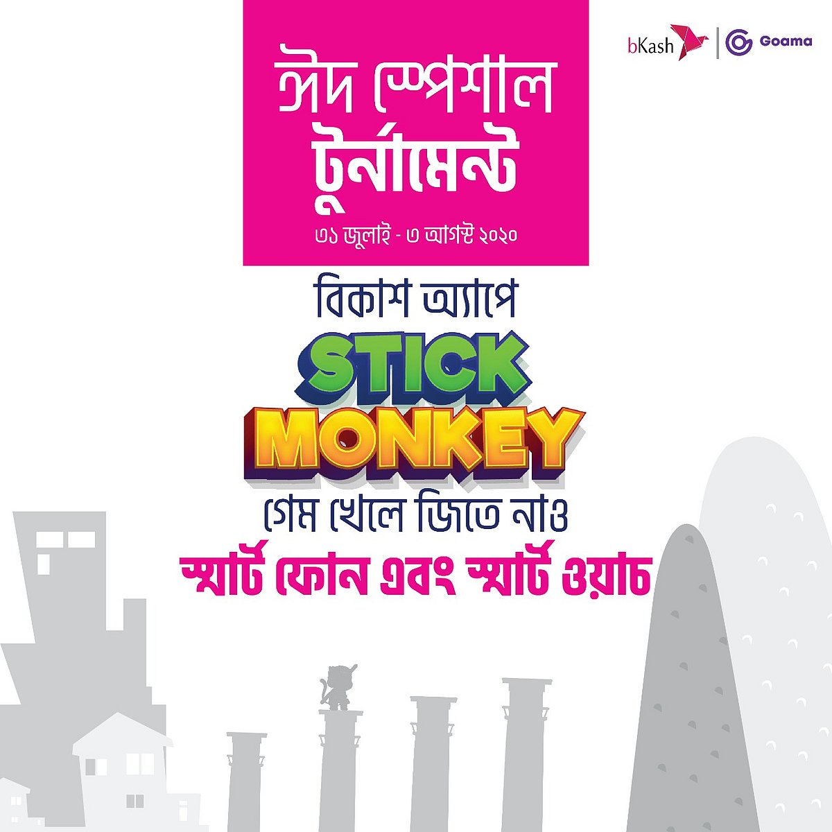ঈদের আনন্দ দ্বিগুণ করতে শুরু হলো bKash-Goama Games ঈদ স্পেশাল টুর্নামেন্ট। ৩১ জুলাই থেকে ৩ আগস্ট পর্যন্ত বিকাশ অ্যাপে Stick Monkey গেম খেলে সুযোগ থাকছে আকর্ষণীয় স্মার্টফোন ও স্মার্টওয়াচ জিতে নেওয়ার।