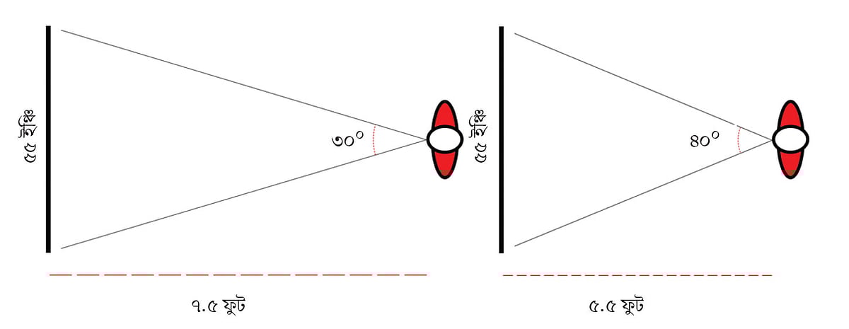 মানুষ তার সামনের ১৩৫ ডিগ্রি পরিমাণ অংশ দেখতে পারে। আর এখানে প্রায় সম্পূর্ণ অংশজুড়েই যদি একটি মাত্র কিছু দেখা যায়, তবে সেটি মস্তিষ্কের ওপর চাপ সৃষ্টি করে। সোসাইটি অব মোশন পিকচার অ্যান্ড টেলিভিশন ইঞ্জিনিয়ার্সের পরামর্শ হলো, টেলিভিশন এমন একটি দূরত্ব থেকে দেখা উচিত, যেন তা দৃশ্যমান অংশের বা ফিল্ড অব ভিউ ৩০ ডিগ্রি থেকে সর্বোচ্চ ৪০ ডিগ্রি দখল করে থাকে। উদাহরণ হিসেবে বলা যেতে পারে যে ৪০-৪৫ ইঞ্চি মডেলের টেলিভিশনগুলো সাড়ে ৫ থেকে ৬ ফুট দূরত্ব থেকে দেখা উচিত এবং কোনোভাবেই ৪ ফুটের কাছে থেকে দেখা উচিত নয়।
