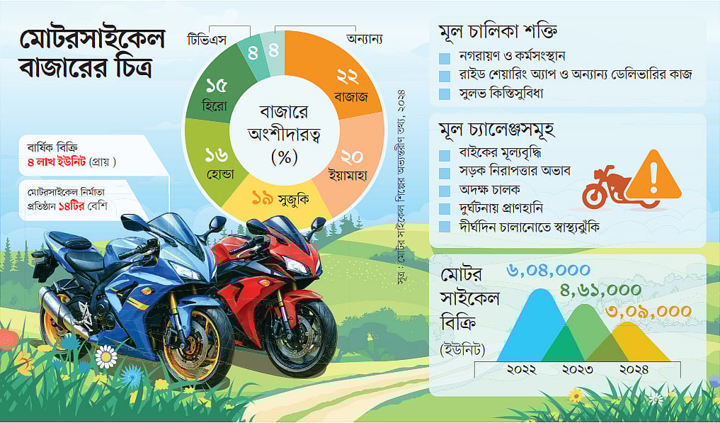 ২০২৫ সালে দেশের মোটরসাইকেলের বাজারের আকার আনুমানিক ২০০ কোটি মার্কিন ডলারের এবং ২০২৯ সালের মধ্যে এটি পৌঁছাতে পারে ২১০ কোটি ডলারে। তবে সাম্প্রতিক বছরগুলোতে বাজারে দেখা দিয়েছে উল্লেখযোগ্য অস্থিরতা ও চ্যালেঞ্জ। ২০২৪ সালে মোটরসাইকেলের বিক্রি ছিল মাত্র ৩ লাখ ৯ হাজার ইউনিট, যা গত ছয় বছরের মধ্যে সর্বনিম্ন। ডলার–সংকট, মূল্যস্ফীতি, উচ্চ আমদানি খরচ এবং রাজনৈতিক অস্থিরতা, এ চারটি বড় কারণ ক্রয়ক্ষমতা ও চাহিদা দুই–ই কমিয়ে দিয়েছে। যেখানে ২০২২ সালের ৬ লাখ ৪ হাজার ইউনিট মোটরসাইকেল বিক্রি হয়েছে, সেখানে ২০২৩ সালে এসে বিক্রি হয়েছে মাত্র ৪ লাখ ৬১ হাজার ইউনিট। ২০২২ সালের তুলনায় ২০২৩ সালে ২৮ শতাংশ বিক্রি কমেছে।