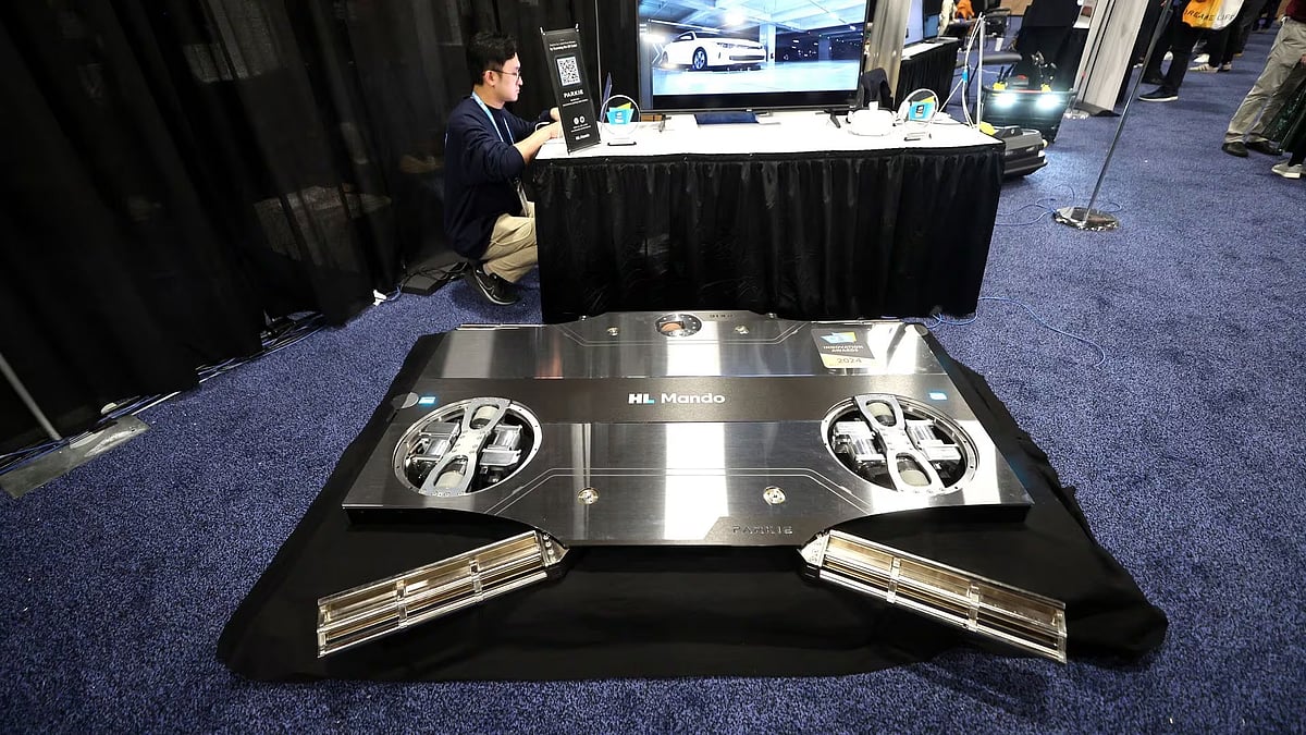 ছবি ১: পার্কিং লটে গাড়ি রাখলেই নির্দিষ্ট স্থানে নিয়ে যেতে পারে এই রোবট। ‘পার্কি ভ্যালেট পার্কিং’ নামের রোবটটি প্রদর্শন করছে এইচএল ম্যান্ডো। রয়টার্স