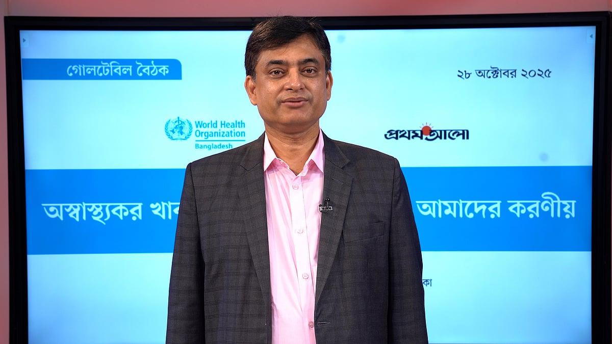 মঙ্গলবার (১১ নভেম্বর) বিশ্ব স্বাস্থ্য সংস্থার (ডব্লিউএইচও) সহায়তায় প্রথম আলো আয়োজন করে ‘অস্বাস্থ্যকর খাবারের পুষ্টি ও স্বাস্থ্যঝুঁকি: আমাদের করণীয়’ শীর্ষক গোলটেবিল বৈঠক। দেশে অপুষ্টি পরিস্থিতি, খাদ্যাভ্যাস, বিধিবিধান—এসব নিয়ে কথা বলেন বাংলাদেশ নিরাপদ খাদ্য কর্তৃপক্ষের সদস্য (খাদ্য শিল্প ও উৎপাদন) অধ্যাপক ড. মোহাম্মদ শোয়েব।