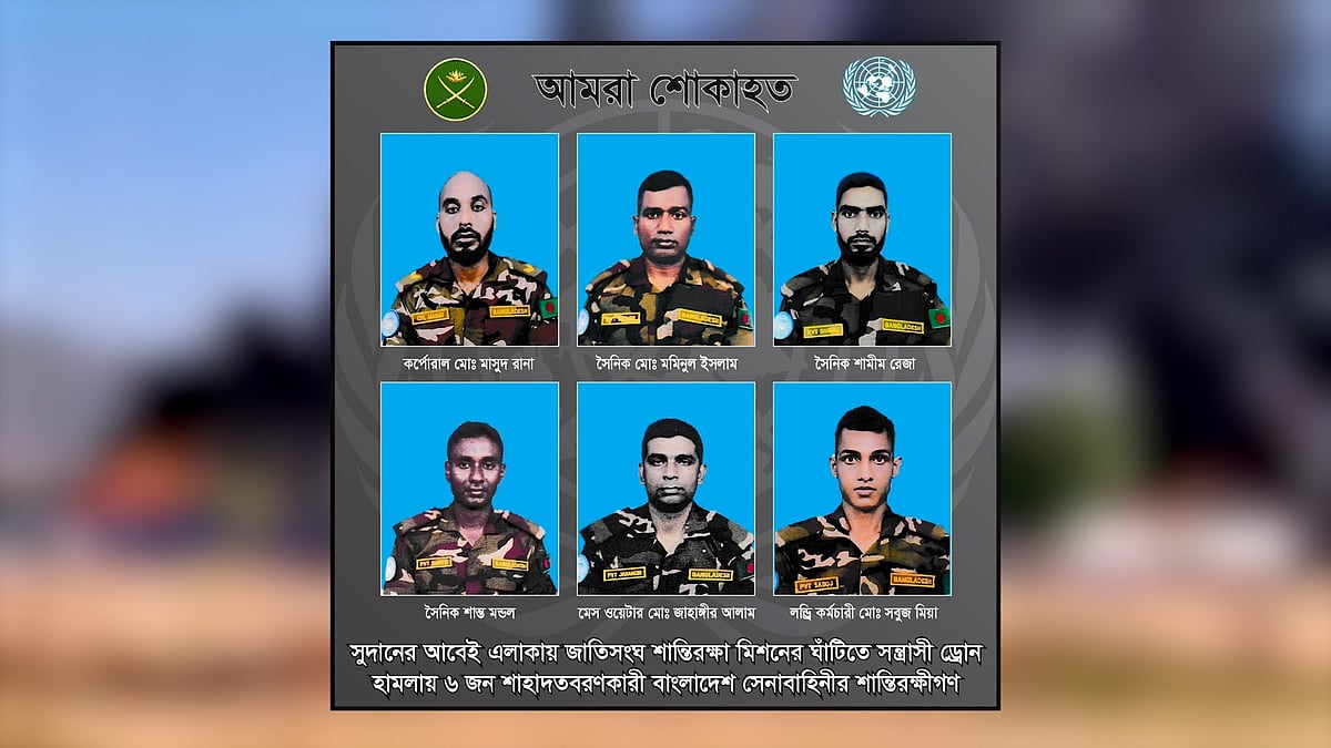 <p>সুদানে সন্ত্রাসীদের হামলায় ছয় বাংলাদেশি শান্তিরক্ষী নিহত হয়েছেন ও আটজন আহত হয়েছেন বলে জানিয়েছে বাংলাদেশের আন্তঃবাহিনী জনসংযোগ পরিদপ্তর–আইএসপিআর। বিস্তারিত প্রতিবেদনে...</p>
