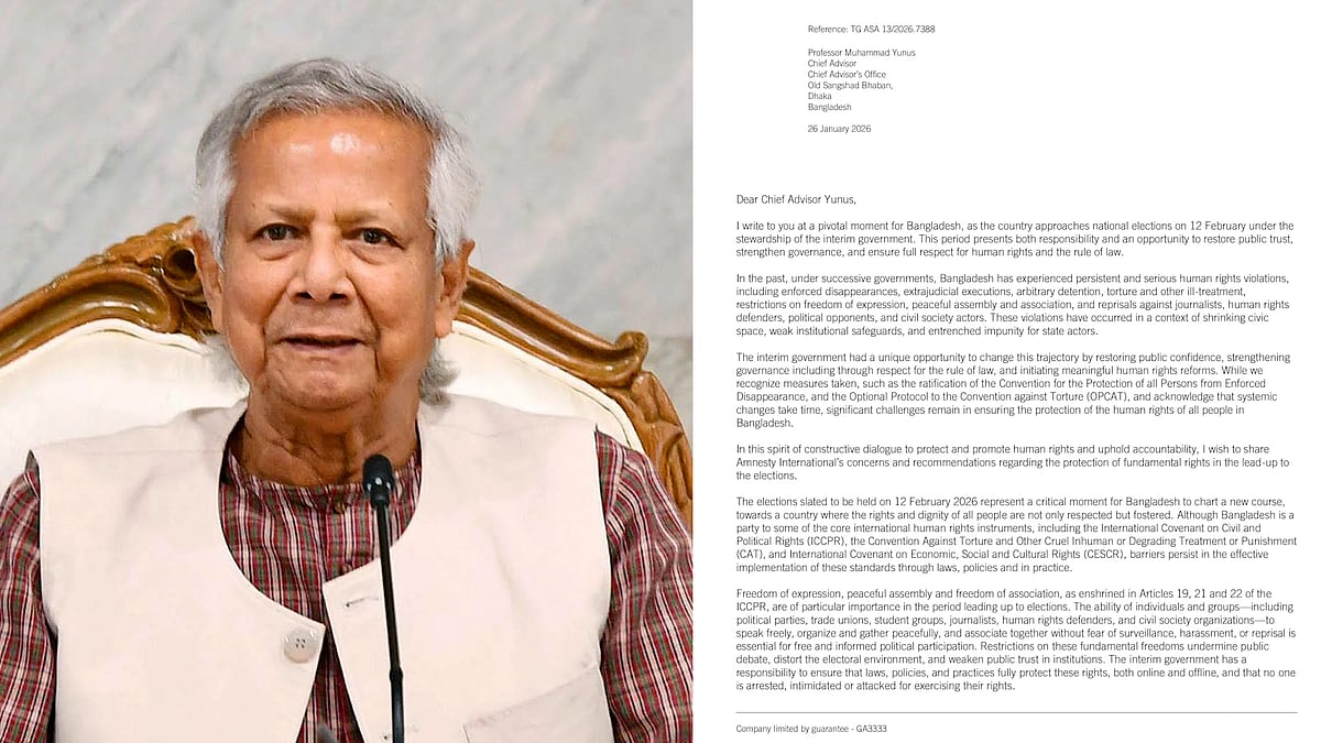 ১২ ফেব্রুয়ারি অনুষ্ঠিতব্য ত্রয়োদশ জাতীয় নির্বাচনের আগে জন–আস্থা পুনরুদ্ধারে মানবাধিকার ও আইনের শাসনের প্রতি পূর্ণ শ্রদ্ধা নিশ্চিত করতে অন্তর্বর্তী সরকারের প্রতি আহ্বান জানিয়েছে অ্যামনেস্টি ইন্টারন্যাশনাল। প্রধান উপদেষ্টা ড. মুহাম্মদ ইউনূসের কাছে লেখা এক খোলা চিঠিতে এ আহ্বান জানান সংস্থাটির মহাসচিব অ্যাগনেস ক্যালামার্ড। ২৮ জানুয়ারি লন্ডনভিত্তিক আন্তর্জাতিক মানবাধিকার সংস্থাটির ওয়েবসাইটে খোলা চিঠিটি প্রকাশ করা হয়। বিস্তারিত ভিডিওতে….