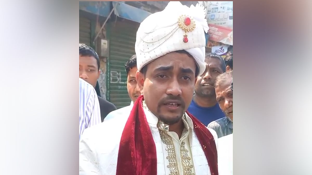<p>নীলফামারীর সৈয়দপুর পাইলট উচ্চ বিদ্যালয় কেন্দ্রে বিয়ের পোশাকে ভোট দেন মো. সামিউল ইসলাম। নির্বাচনের দিনটিকে স্মরণীয় করে রাখতে তিনি বিয়ের তারিখ মিলিয়েছেন ভোটের দিনের সঙ্গে।</p>