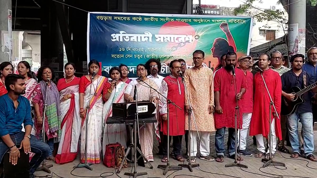 <p>বগুড়ায় জাতীয় সংগীত পরিবেশনের অনুষ্ঠানকে কেন্দ্র করে বাংলাদেশ উদীচী শিল্পীগোষ্ঠীর ওপর হামলার ঘটনায় ১৬ মে ঢাকায় প্রতিবাদ সমাবেশ অনুষ্ঠিত হয়। বিস্তারিত ভিডিওতে... </p>
