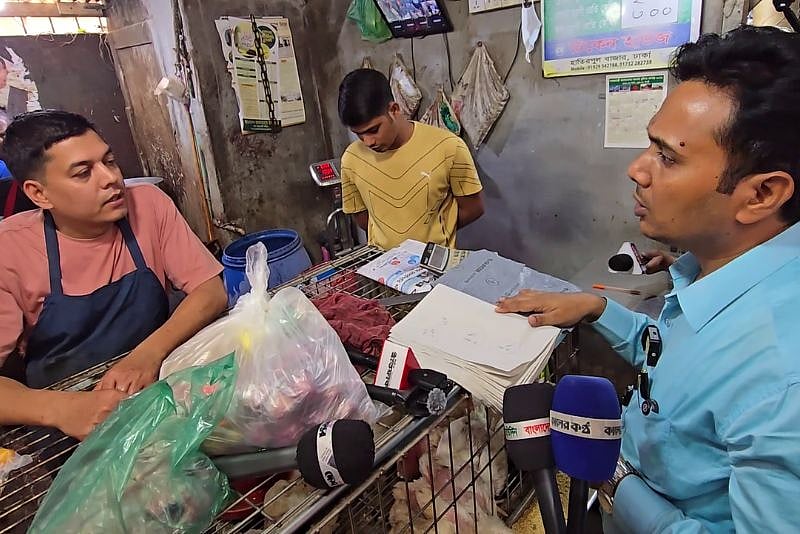 <p>মূল্যতালিকার চেয়ে কেজিপ্রতি ১০-২০ টাকা বেশি দামে মুরগি বিক্রি করায় দোকানিকে জরিমানা করেছে জাতীয় ভোক্তা অধিকার সংরক্ষণ অধিদপ্তর। ২৫ ফেব্রুয়ারি রাজধানীর হাতিরপুল কাঁচাবাজারে কার্যক্রম পরিচালনার সময় এ জরিমানা করা হয়। বিস্তারিত দেখুন ভিডিওতে—</p>