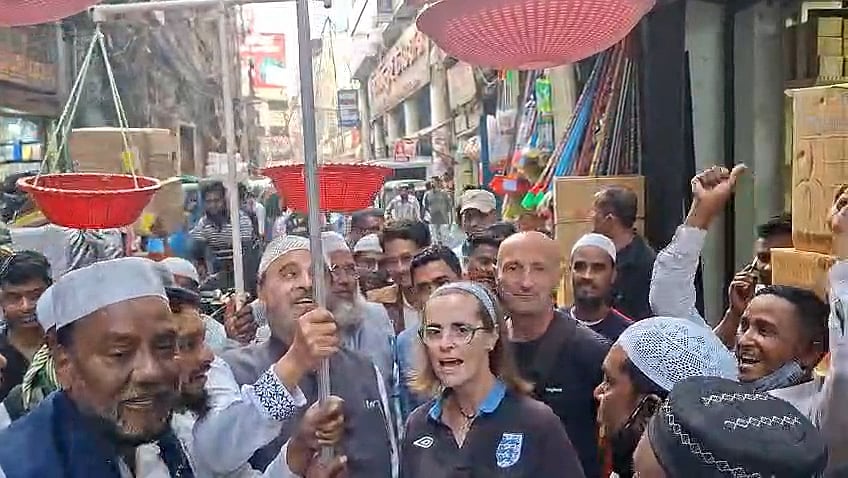 ঢাকা-৭ আসনের জামায়াতে ইসলামীর প্রার্থী মো. এনায়েত উল্লার নির্বাচনী গণসংযোগ চলাকালে দুই ব্রিটিশ নাগরিককে ‘দাঁড়িপাল্লা’ স্লোগান দিতে দেখা গেছে। সোমবার (২৬ জানুয়ারি) বিকেলে রাজধানীর মিটফোর্ড এলাকা দিয়ে যাতায়াতের সময় প্রচারণার স্লোগান শুনে তাঁরা হঠাৎ করেই স্লোগানে অংশ নেন। ঘটনাটি উপস্থিতদের দৃষ্টি আকর্ষণ করে। বিস্তারিত ভিডিও প্রতিবেদনে—