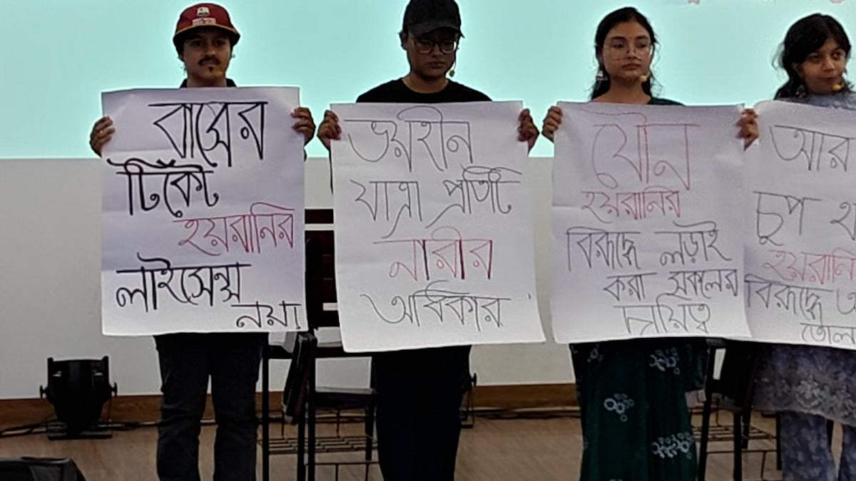 গণপরিবহনে যৌন হয়রানি প্রসঙ্গে কথা বলেছেন প্রধান উপদেষ্টার সড়ক পরিবহন ও সেতু মন্ত্রণালয়বিষয়ক বিশেষ সহকারী শেখ মইনউদ্দিন। বৃহস্পতিবার ঢাকা পরিবহন সমন্বয় কর্তৃপক্ষ (ডিটিসিএ) ভবনে একটি সচেতনতামূলক প্রচারাভিযানের উদ্বোধনী অনুষ্ঠানে তিনি কথা বলেন। এখানে কয়েকজন প্ল্যাকার্ড প্রদর্শন করেন, যার একটিতে লেখা ছিল ‘বাসের টিকিট হয়রানির লাইসেন্স নয়’। বিস্তারিত দেখুন ভিডিওতে...
