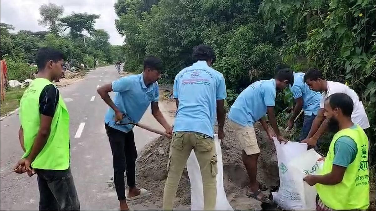 মেঘনা-ধনাগোদা সেচ প্রকল্পের ঝুঁকিপূর্ণ বেড়িবাঁধ মেরামত করছেন শিক্ষার্থীরা