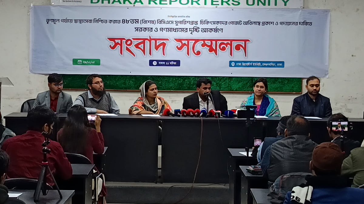 ৪৮তম বিশেষ বিসিএসে সুপারিশপ্রাপ্ত চিকিৎসকদের গেজেট প্রকাশ ও পদায়নের দাবিতে সংবাদ সম্মেলন করেছে চিকিৎসক ফোরাম। তাদের দাবি, দেরির কারণে তৃণমূল স্বাস্থ্যসেবা ও তরুণ চিকিৎসকদের ক্যারিয়ার দুটোই সংকটে পড়েছে। বিস্তারিত ভিডিওতে...