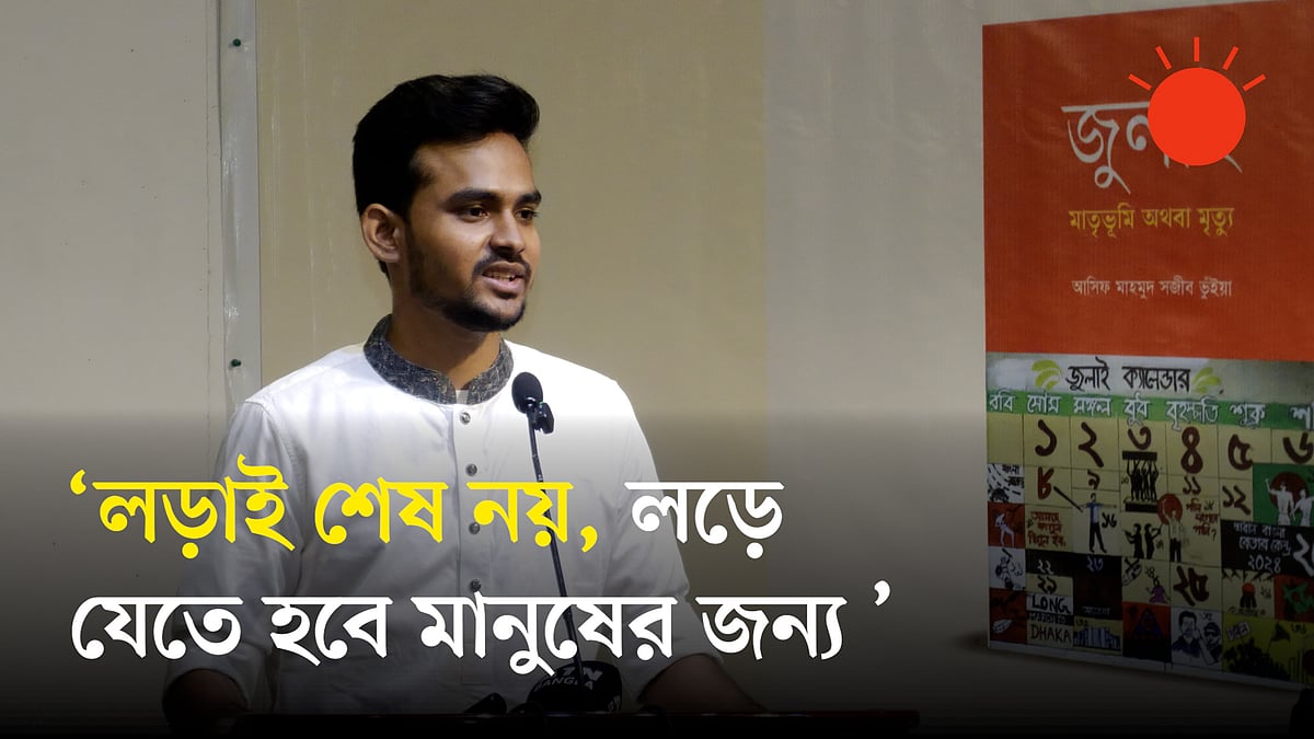 অন্তর্বর্তী সরকারের উপদেষ্টা ও বৈষম্যবিরোধী ছাত্র আন্দোলনের সাবেক সমন্বয়ক আসিফ মাহমুদ সজীব ভূঁইয়ার গণ-অভ্যুত্থানবিষয়ক বই ‘জুলাই: মাতৃভূমি অথবা মৃত্যু’ বইয়ের প্রকাশনা অনুষ্ঠান ১৫ মার্চ বিকেলে রাজধানীর শাহবাগে জাতীয় জাদুঘরের কবি সুফিয়া কামাল মিলনায়তনে অনুষ্ঠিত হয়। বইটি প্রকাশ করেছে প্রথমা প্রকাশন। বই নিয়ে কথা বলেছেন লেখক। বিস্তারিত ভিডিওতে...