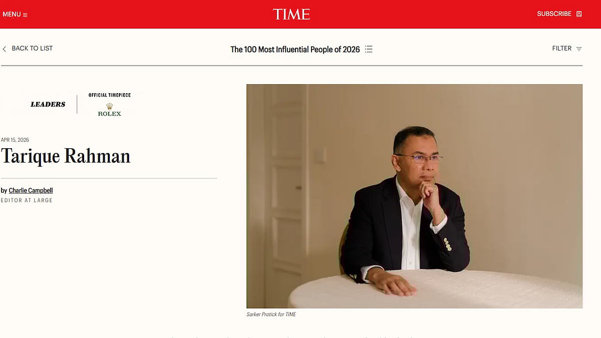 বিশ্বের প্রভাবশালী ১০০ ব্যক্তির তালিকায় উঠে এসেছে বাংলাদেশের প্রধানমন্ত্রী তারেক রহমানের নাম। ১৫ এপ্রিল বুধবার নিউইয়র্কভিত্তিক টাইম ম্যাগাজিনের মর্যাদাপূর্ণ তালিকায় ‘লিডারস’ বা নেতা ক্যাটাগরিতে তাঁর নাম অন্তর্ভুক্ত করা হয়েছে। বিস্তারিত ভিডিও প্রতিবেদনে...